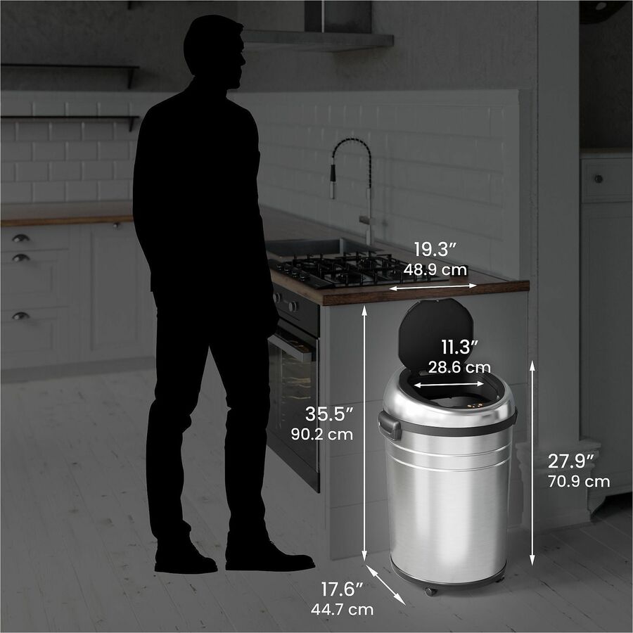 18 gal Capacity - Round - 11.60" Opening Diameter - Touchless - Sensor, Bacteria Resistant, Caster, Mobility, Smudge Resistant, Easy to Clean, Vented - 32.6" Height x 17.5" Width x 19.3" Depth - Stainless Steel - Brushed Stainless Steel - 1 Each