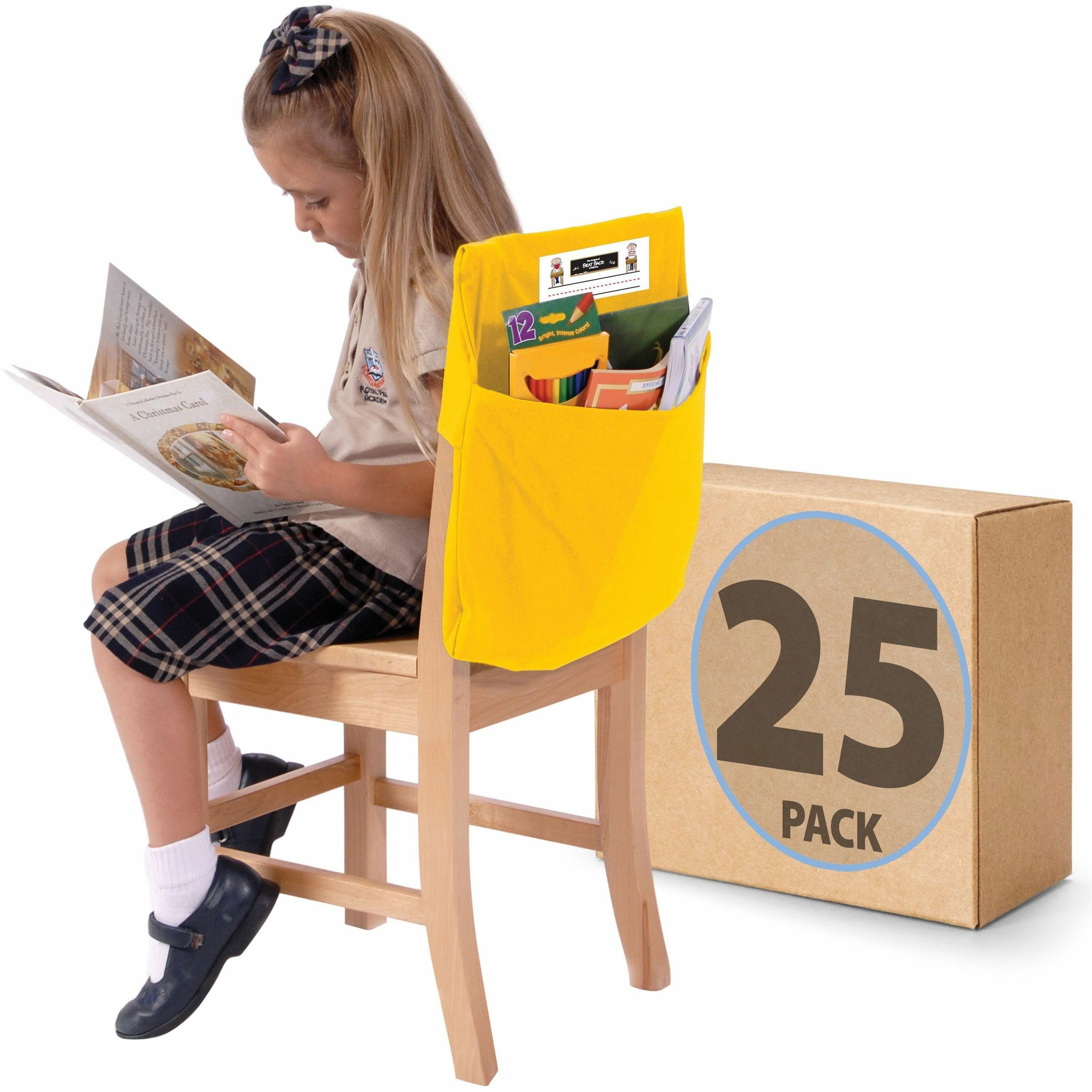 | Marketing Information | Simply slide this one-pocket Seat Sack over a student's chair for quick, convenient, instant organization and storage of school materials. Elastic added across the entire back is designed for classrooms with a large range of chair backs and the hard-to-fit chairs that have measurements of 14" or less across the top of the back. Elastic helps to hold the seat pocket in place on the chair. Roomy storage pocket features a 2" gusset to expand for extra storage. Clear plastic sleeve holds a replaceable name tag. Machine-washable Seat Sack is made of a durable, premium, high-quality, poly/cotton laminated material that is sewn and backstitched. It is certified flame-resistant, CPSIA and Prop 65 and meets additional CA and EU standards. Use on chairs in the classroom, home office, library, music room, church, synagogue or anywhere extra storage space is needed. Set includes a name card for each Seat Sack. |
